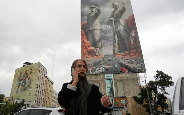 A woman talks on her cellphone as she walks past a billboard showing Rais Ali Delvari, a national hero in an early 1900 uprising against British forces in southern Iran in the Persian Gulf, right, and the late Islamic Revolutionary Guard Corps’ navy chief Alireza Tangsiri, who was killed in the US-Israeli strike in late March 2026, commanding the closure of the Strait of Hormuz, on a building at a square in downtown Tehran, Iran, April 20, 2026. (AP Photo/Vahid Salemi)