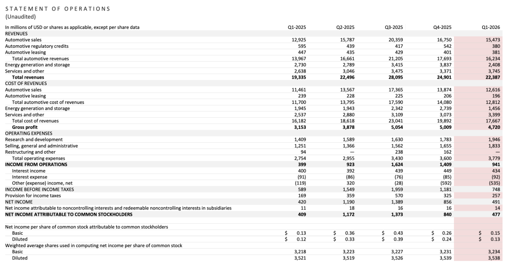 Tesla (TSLA) released its financial results and shareholders’ letter for the first quarter (Q1) 2026 after market close today.