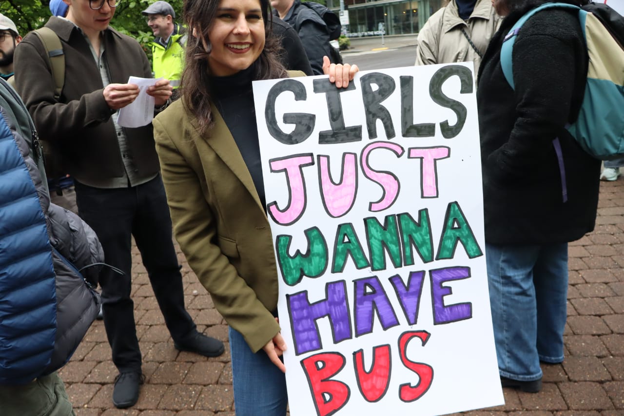 Alexis Mercedes Rinck, who advanced the Better Bus Lanes program last year from the city council, poses Wednesday at Katie Wilson’s announcement. (Ryan Packer)