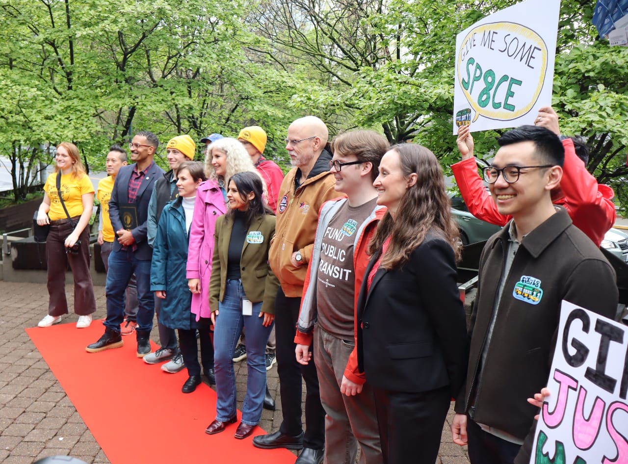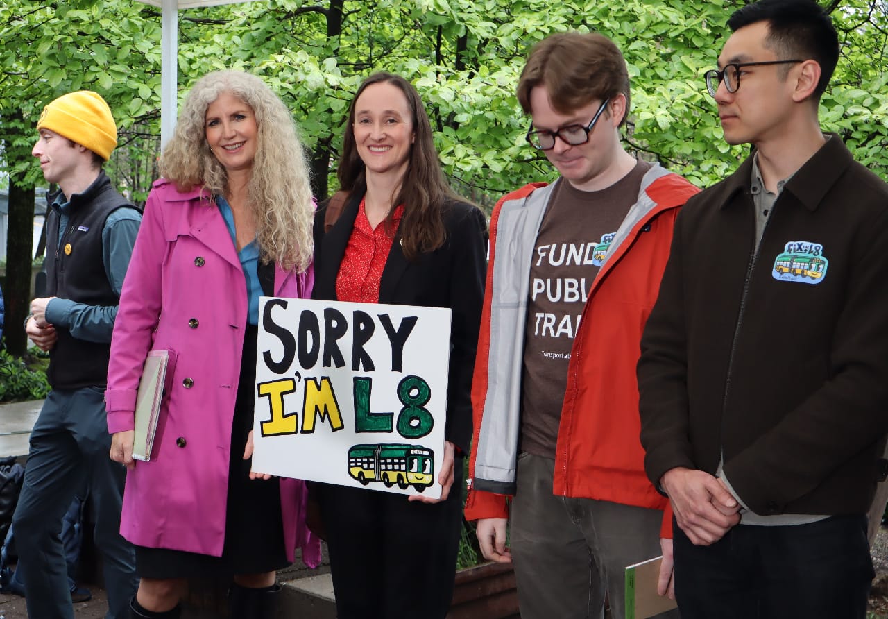 SDOT Director Angela Brady and Mayor Katie Wilson pose with Fix the L8 organizers Nick Sattele and Jason Li at Wednesday’s announcement. (Ryan Packer)
