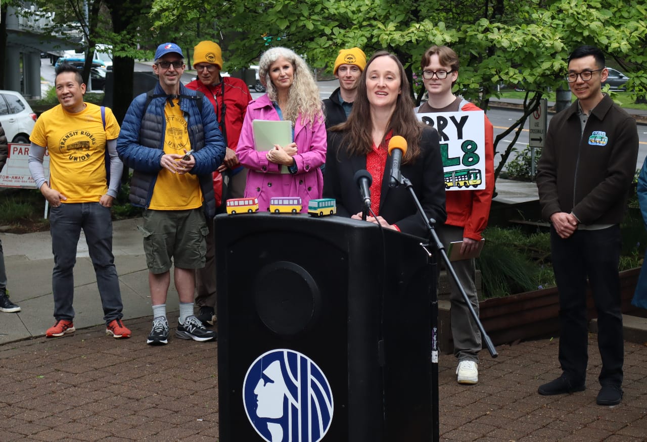 “In 2009 The Stranger deemed Route 8 as Seattle’s crappiest bus route, and it has held that title ever since,” Sattele said Wednesday, taking the stage after Wilson. “Since 2009, South Lake Union has boomed. Capitol Hill and Belltown are some of the densest places in the state, and as mayor Wilson alluded to, Tacocat wrote their anthem F.U. #8. Since that headline, we’ve had six mayors. Six mayors that haven’t acted on making Route 8 the fast, frequent and reliable connection it deserves [to be]. We’ve done more studies and more analysis and more delay, all as we’ve seen climate change get worse, our traffic get worse and our transit slowly, slowly gets slower.”