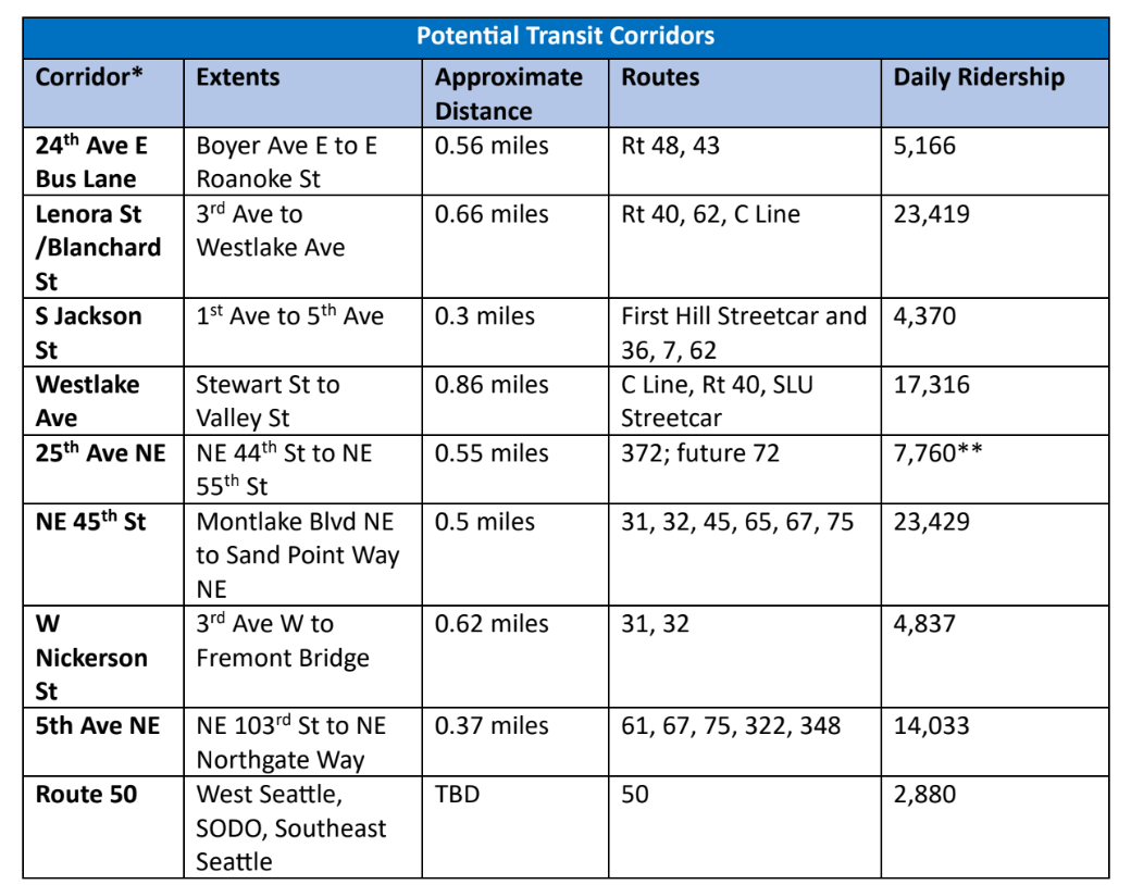 “These corridors were selected because they rank in the top 15% of the network for priority locations to address delay and unreliability in the system, when also considering ridership, frequency, and equity, and after screening out segments already addressed by the Move Seattle Levy, 2024 Transportation Levy projects, or individual transit spot improvement projects,” the memo noted. “Delay scores were either significantly above the Seattle Transportation Plan target of being within 20% of free-flow travel time or were very unreliable. By focusing transit performance improvements on these corridors, SDOT expects to deliver benefit for riders across the transit network.”