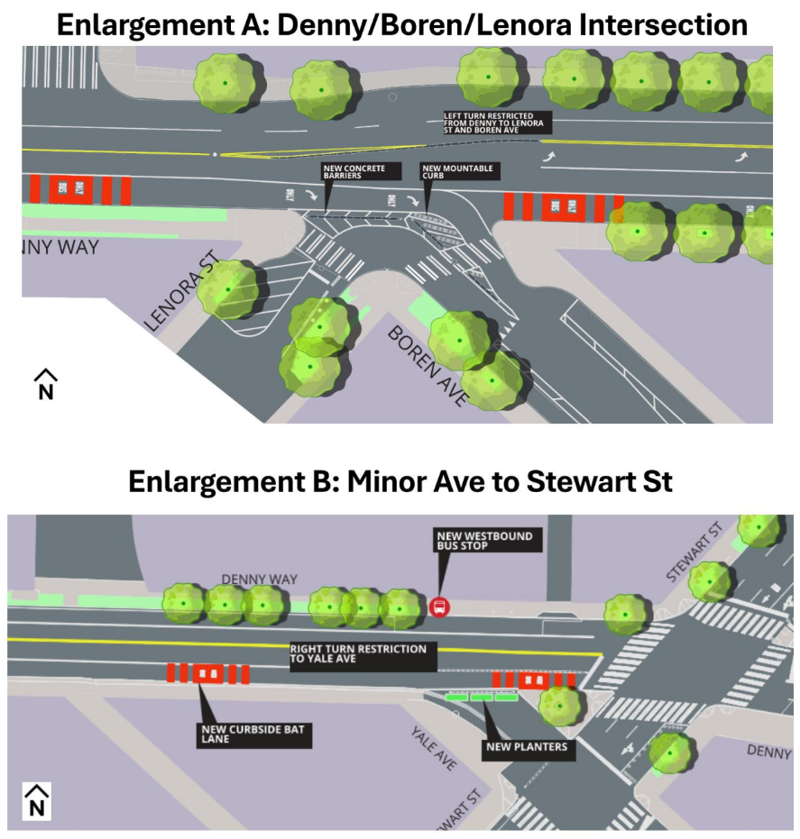 After these changes are made in August, drivers heading to the southbound I-5 ramp at Yale Avenue from Denny Way won’t be able to make their turn at Stewart Street since the slip lane from eastbound Denny to Yale will permanently close, improving pedestrian safety. Instead I-5 bound motorists will turn right at a reconfigured Boren Avenue intersection, and take a left onto Howell Street to reach the ramp.