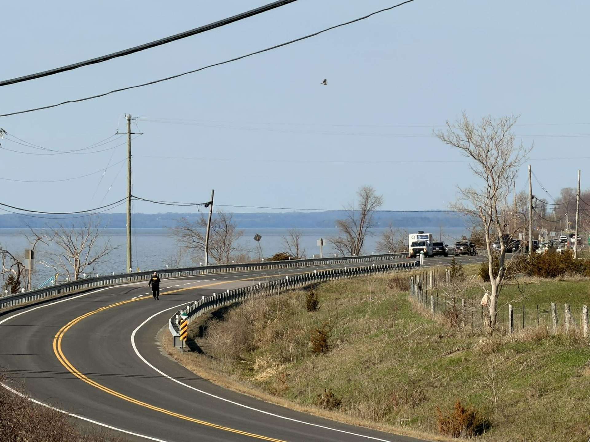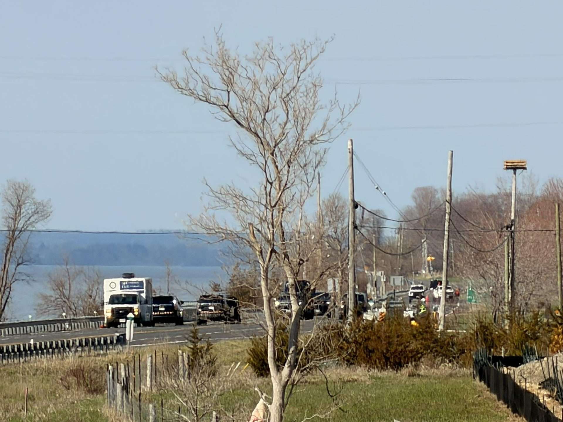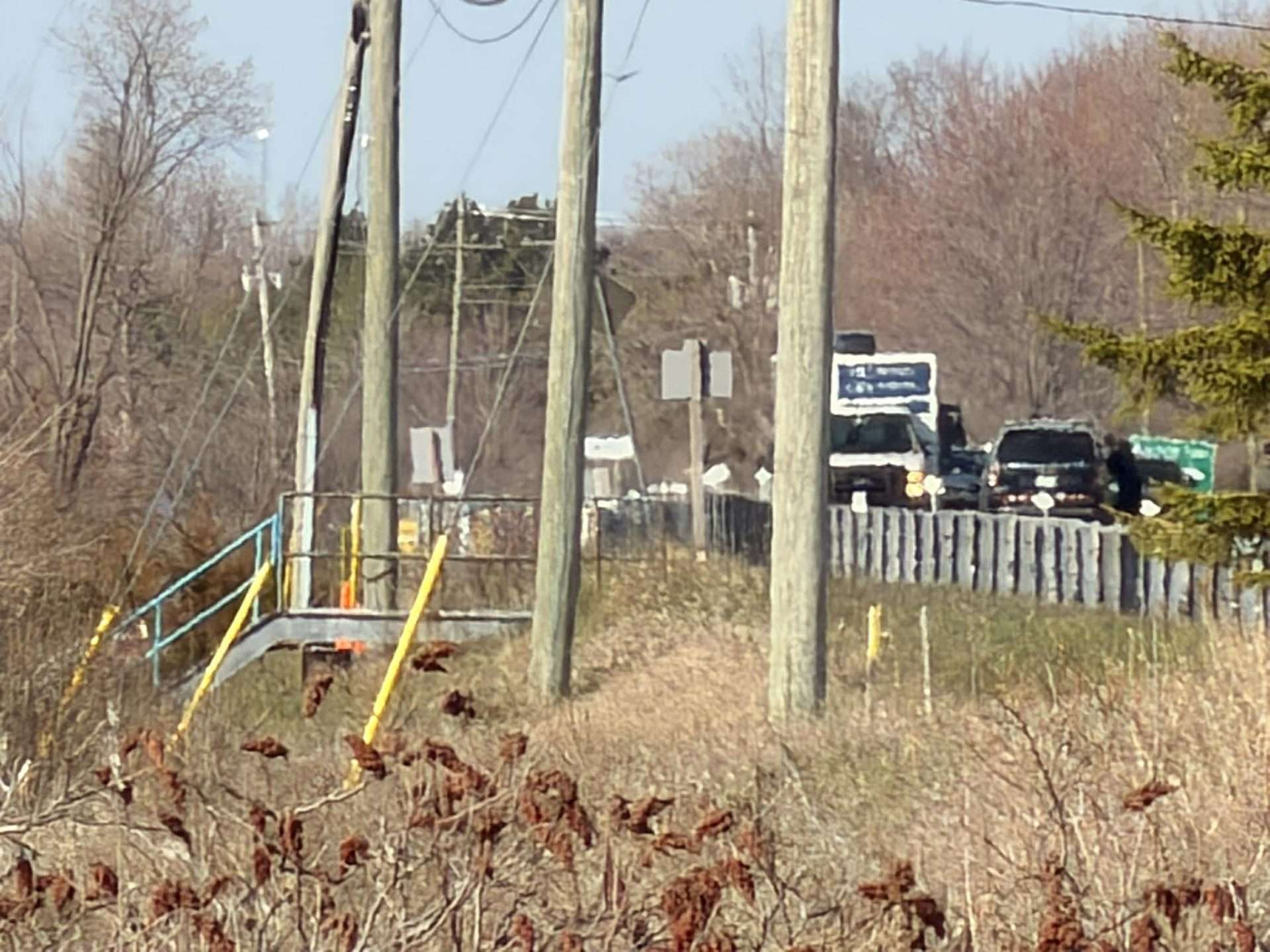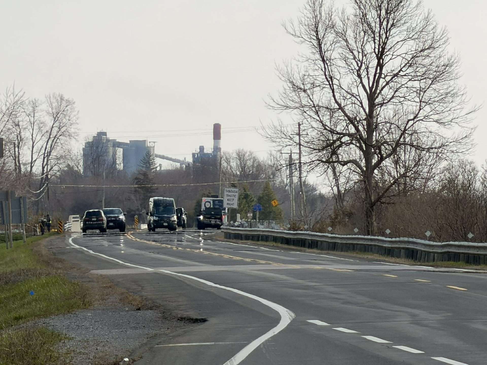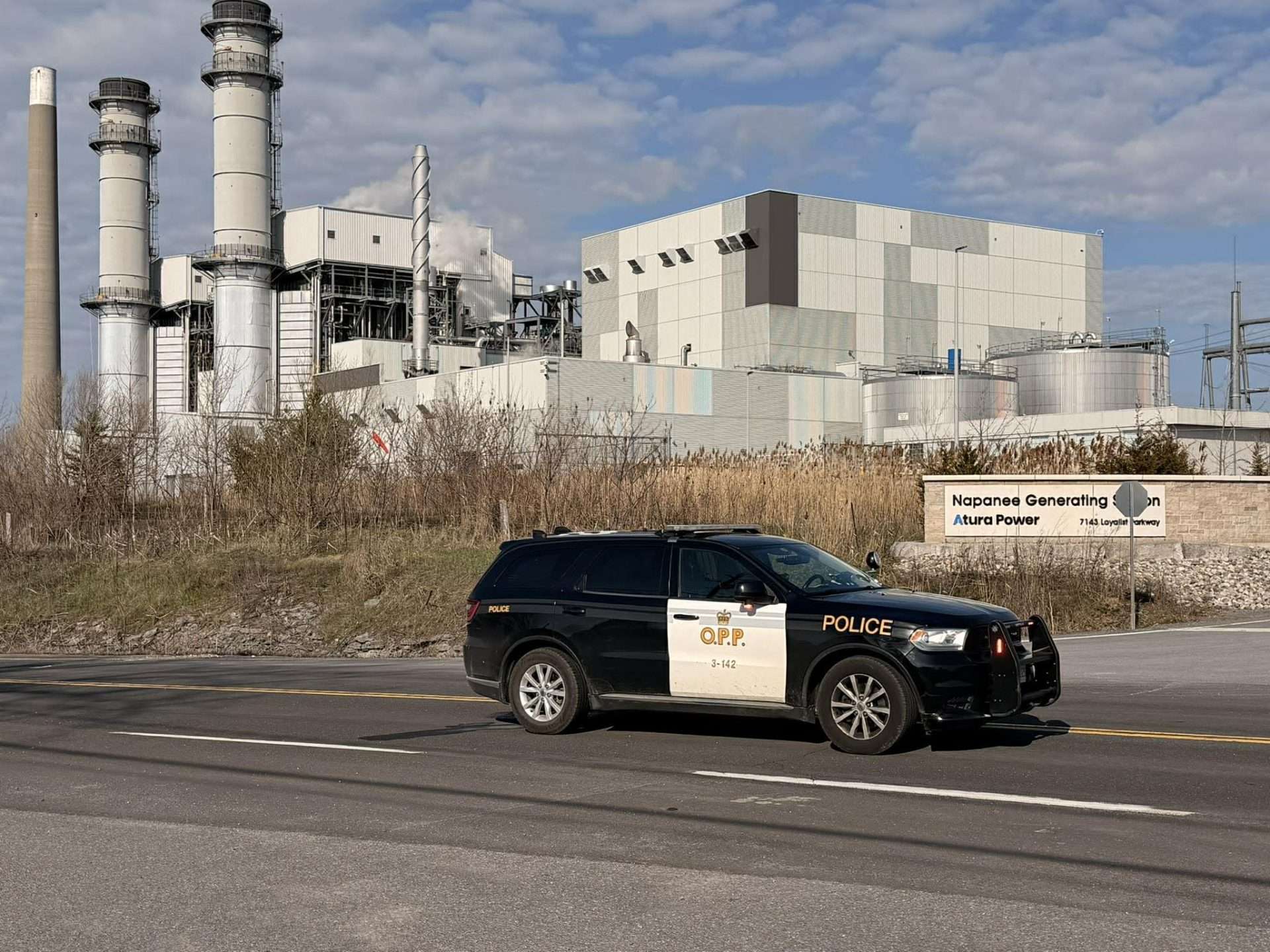 An Ontario Provincial Police (OPP) vehicle blocks traffic on Highway 33 at the Napanee Generating Station on the morning of Wednesday, Apr. 22, 2026, following an incident that led to a vehicle driving off the road and into the water in the area the night prior. Photo by Cris Vilela/Kingstonist.