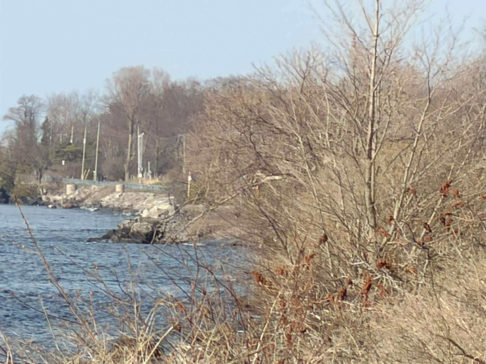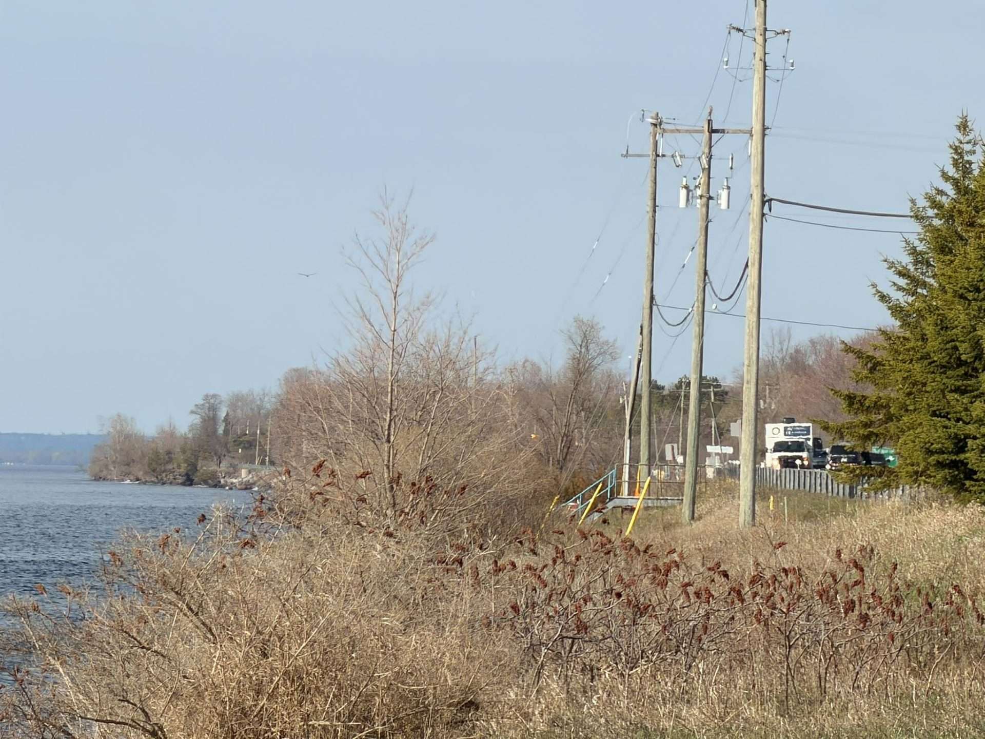 The focus of emergency responders and investigators seemed to centre around this area of the south side of Highway 33, indicating it is likely the area where the vehicle entered Lake Ontario. Photos by Cris Vilela/Kingstonist.