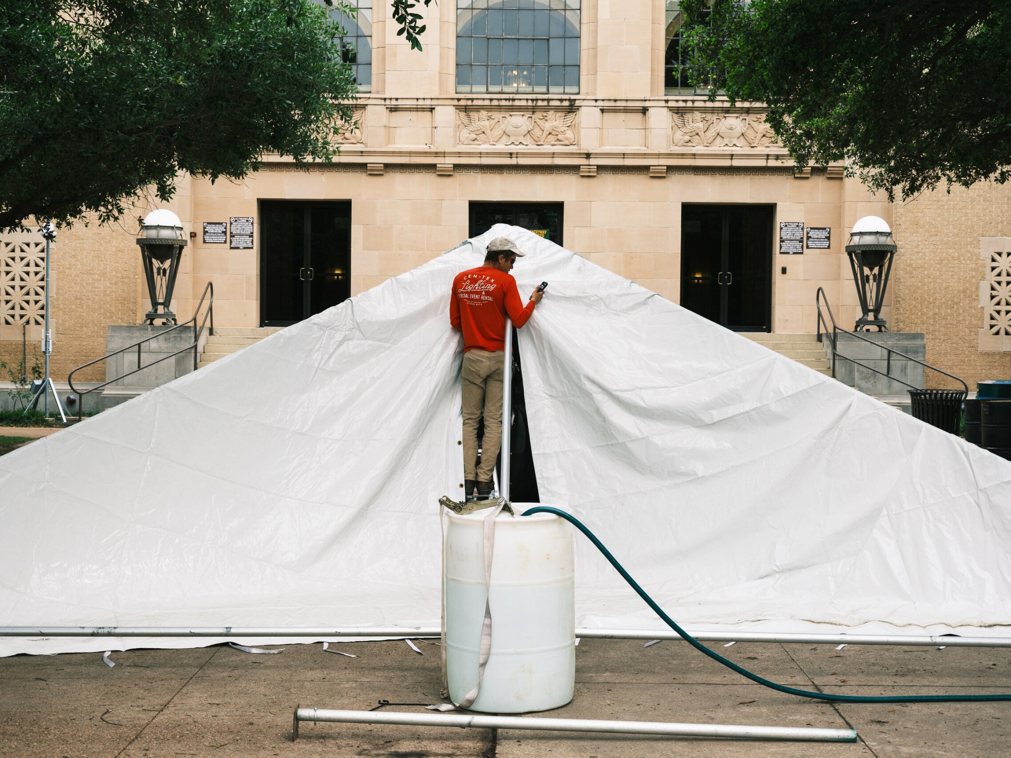 A man sets up an event tent in front of Waco Hall at Baylor University on April 20, 2026. Turning Point USA is set to host their only tour stop in Texas at Baylor on April 22. Justin Hamel / The Waco Bridge / CatchLight Local / Report for America