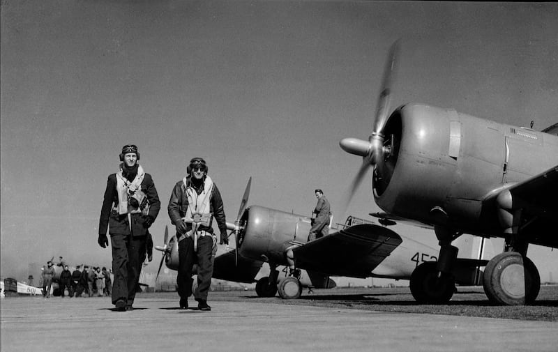 Little Norway Pilot trainees stride past three P-36 trainers at ‘Little Norway’ Training Centre Flying Field Toronto Island, Ont. in April 1941. (CP PHOTO — National Archives of Canada)