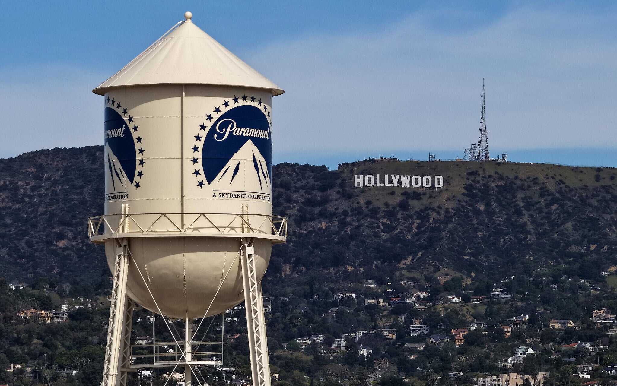 An aerial view of the Paramount logo on the water tower at Paramount Studios on February 23, 2026, in Los Angeles, California. (Justin Sullivan/Getty Images/AFP)