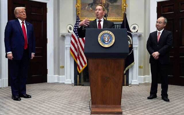 Larry Ellison, chairman of Oracle Corporation, center, speaks as US President Donald Trump, left, and Masayoshi Son, SoftBank Group CEO, listen in the Roosevelt Room at the White House, January 21, 2025, in Washington. (AP/Julia Demaree Nikhinson)
