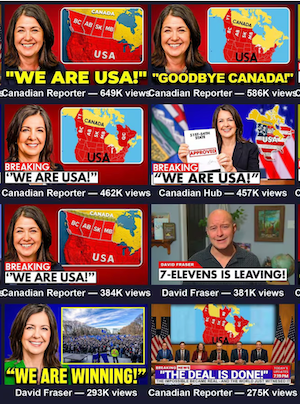 Some of the AI-generated Dutch-made slopaganda YouTube pages intended to boost Alberta separation identified by the CBC (Image: CBC).
