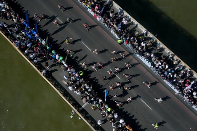 <p>An aerial view view of runners crossing Tower Bridge during the 2026 TCS London Marathon. Picture date: Sunday April 26, 2026.</p>