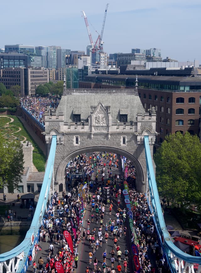 Runners crossing Tower Bridge during the 2026 TCS London Marathon. Picture date: Sunday April 26, 2026.