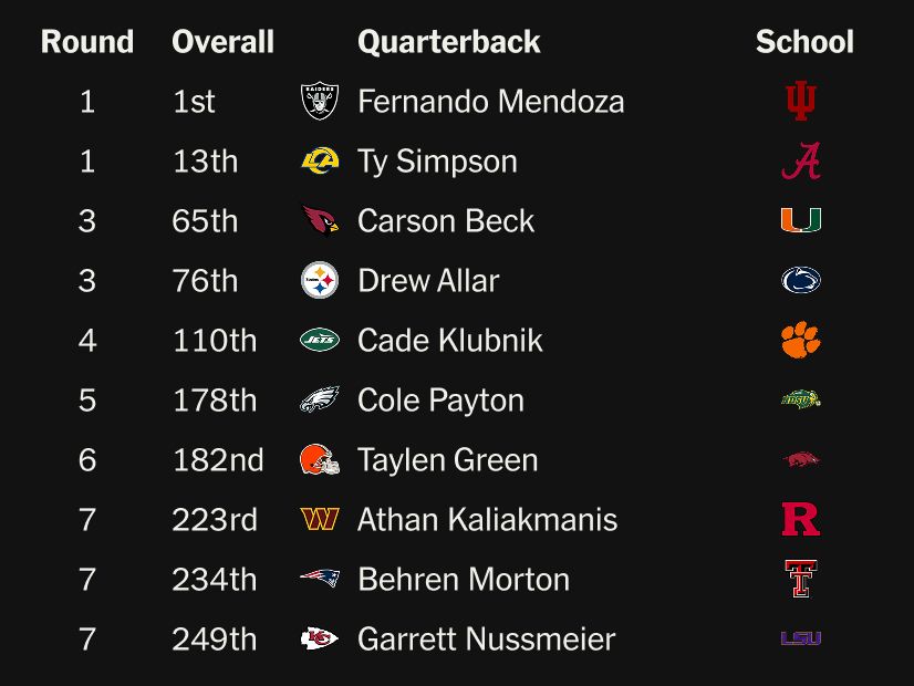 Back to quarterbacks for a minute: The first one drafted in each class has a better pro career than his QB classmates 40 percent of the time, historically. That drops to 13 percent for the second and third quarterbacks drafted, in this case the Rams’ Ty Simpson and Cardinals’ Carson Beck. Here’s where passers landed: