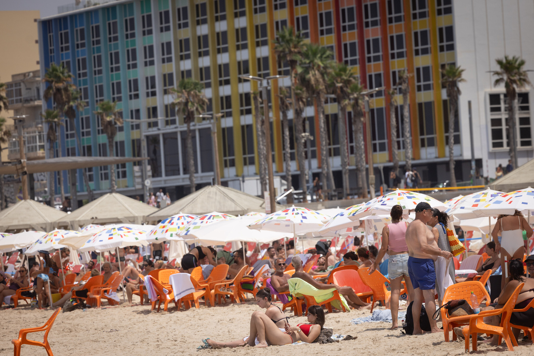 Beachgoers seen in Tel Aviv on a hot summer day, August 13, 2025. (Miriam Alster/ Flash90)