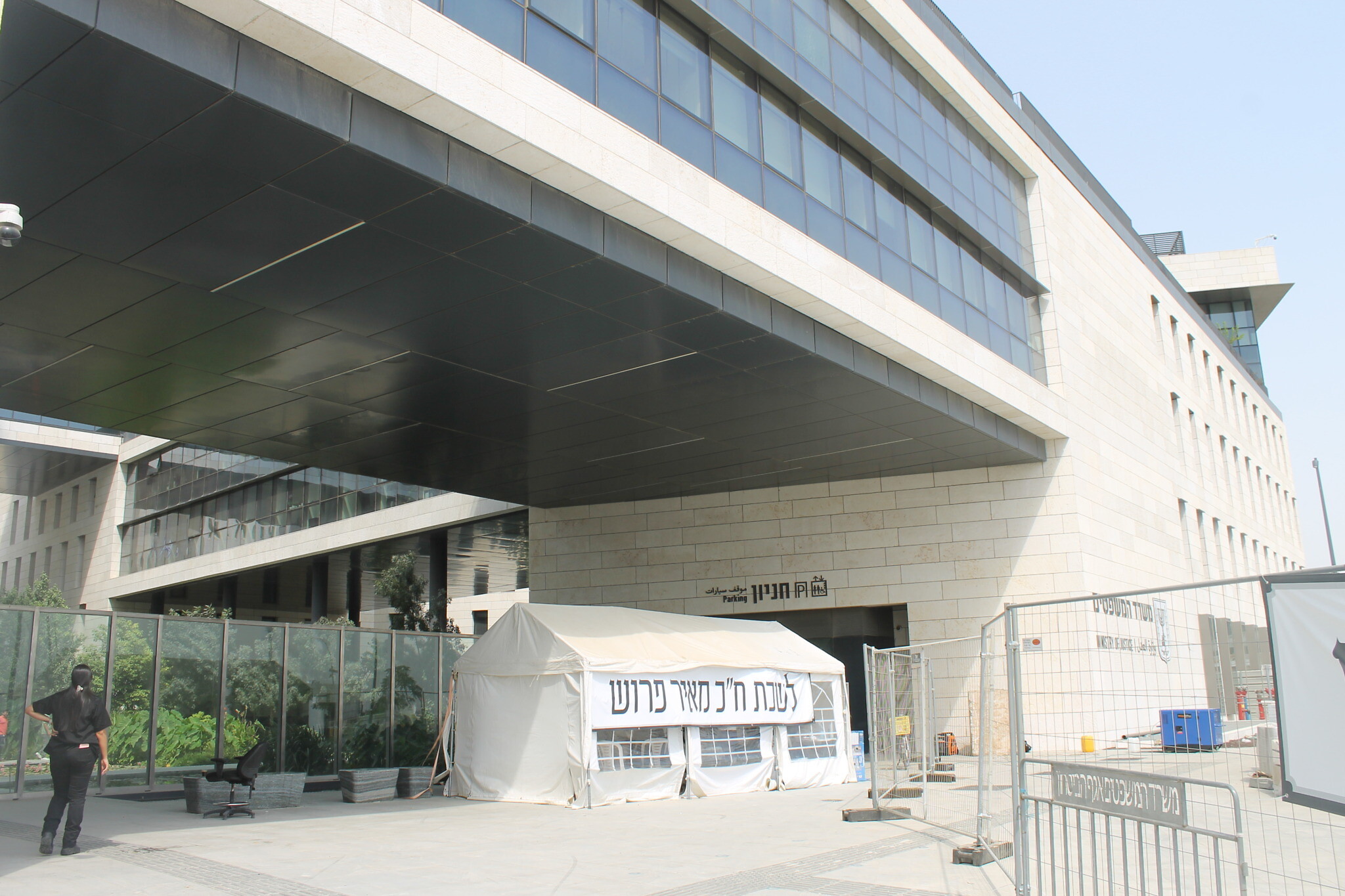 UTJ MK Meir Porush’s protest tent at the entrance to the Justice Ministry in Jerusalem, August 12, 2025. (Sam Sokol/The Times of Israel)