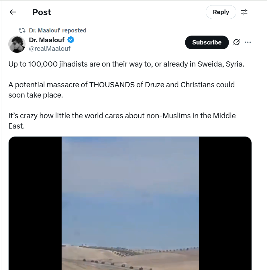 This indifference speaks volumes about the selective compassion that governs international response. Religious minorities in the Middle east have been systematically targeted for years, yet appeals for help are met with diplomatic platitudes instead of action. If tens of thousands of jihadists were marching toward any Western city, the world would be in a state of emergency. But because it’s Sweida — home to communities already diminished and isolated — the alarm is muted. The world’s silence in moments like these is not just neglect; it is complicity. If no one acts now, we may soon witness another preventable genocide — one that history will condemn, and conscience should never forget.