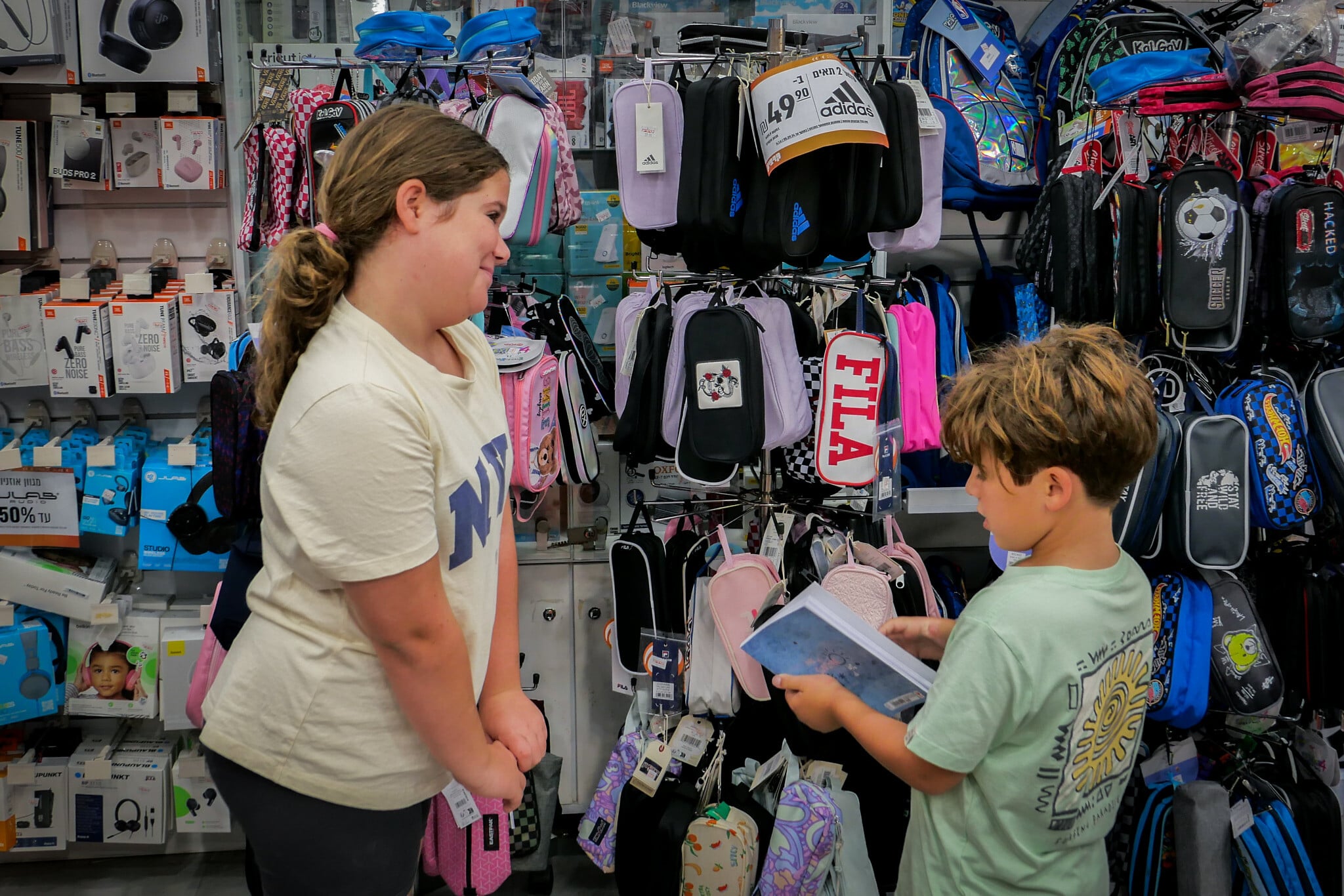 Schoolchildren buy equipment for the new school year at a store in Jerusalem, August 26, 2024. (Nati Shohat/Flash90)