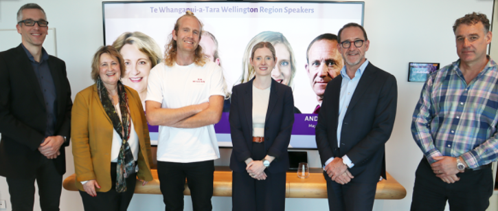 Wellington councillor and mayoral candidate Diane Calvert alongside candidates Alex Baker (Wellington), Peri Zee (Upper Hutt) and Andrew Little (Wellington). The mayoral candidates are flanked by Urban Design Forum co-chair Jos Coolen and James Solari of the Urban Development Institute of New Zealand.