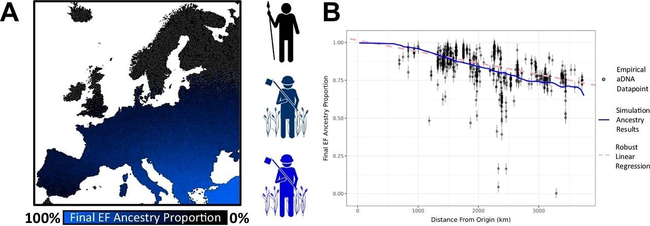 Farming spread through migration, not local adoption, ancient DNA revealsEffect of cultural transmission on final EF ancestry proportion on a European landscape. Credit: T.M LaPolice et al., Nat Commun (2025)