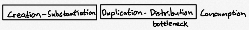 Now the new bottleneck was duplication: to reach more people whatever was written had to be painstakingly duplicated by hand, which dramatically limited what ideas were recorded and preserved. The printing press removed this bottleneck, dramatically increasing the number of ideas that could be economically distributed: