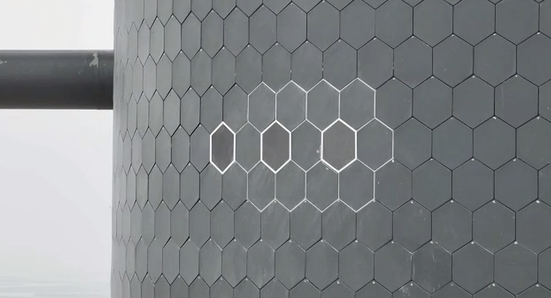 A view of a portion of Starship’s heat shield, including three experimental metallic tiles. Each tile is about the size of a dinner plate.