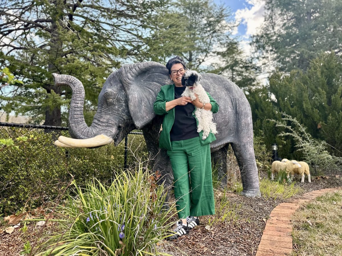 A whole animal farm has taken over the front lawn of 51 Dominion Circuit, including two elephants, a pig, five sheep, a couple of lambs and piglets, a monkey, a sheep dog, several chickens, and yep, a four-metre-tall fibreglass giraffe.