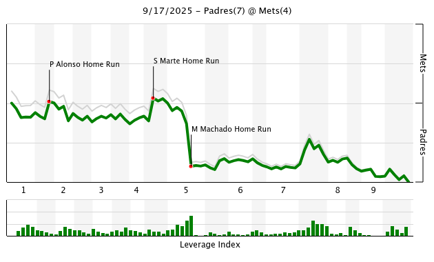 Peterson hit Jake Cronenworth with a pitch to lead off the top of the fifth. Elias Díaz bunted him over to second. Tatis walked to make it first and second with one out. Luis Arraez caught the Mets off guard with a bunt single to load the bases for Manny Machado. Peterson was allowed to face the right handed Machado and that quickly proved to be a very poor choice, as the third baseman hit a grand slam to make it 6-2, and all but put this one to bed.