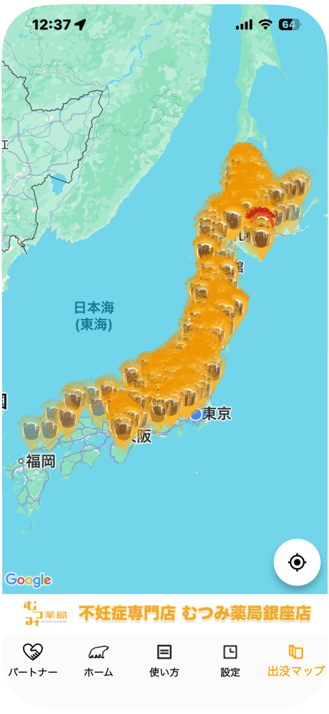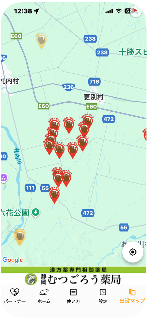 First, the app contains a map of Japan with places where bears were spotted marked in orange. Spots where bears were confirmed to have been are marked in red. Also, if you spot a bear, you can report it through the app and update the map.