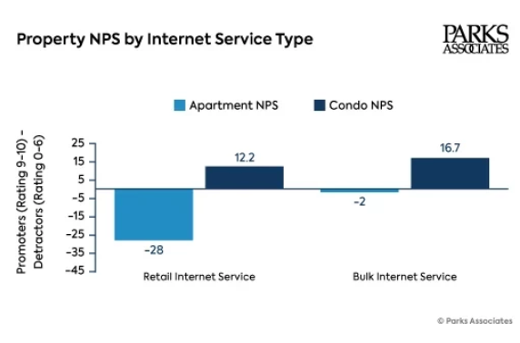 As of Q1 2025, the NPS for apartments overall is critically low, at -25: properties without bulk internet on average have a NPS of -28, while adding bulk internet boosts this by 26 points.