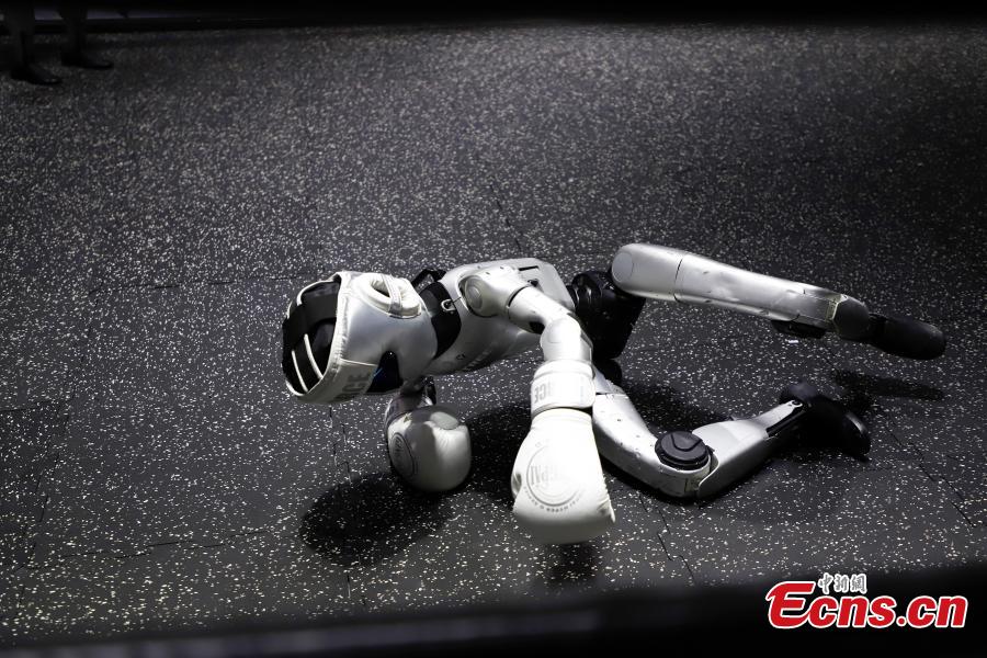 A humanoid robot is knocked down at a humanoid robot boxing competition during the 4th Global Digital Trade Expo in Hangzhou, east China’s Zhejiang Province, on Sept. 25, 2025. (Photo provided to China News Service)