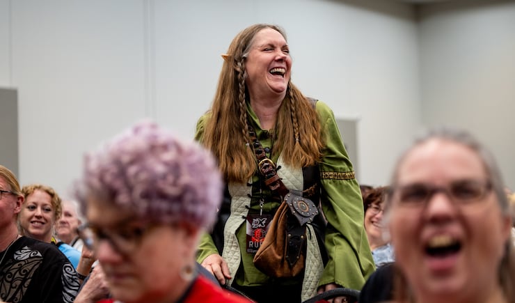 Teresa Norvick stands up to be recognized because it is her birthday during a “Happy Days” panel discussion at FanX Salt Lake Pop Culture and Comic Convention at the Salt Palace Convention Center in Salt Lake City on Thursday, Sept. 25, 2025. | Tess Crowley, Deseret News