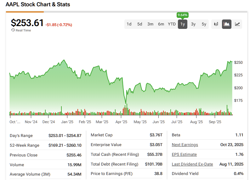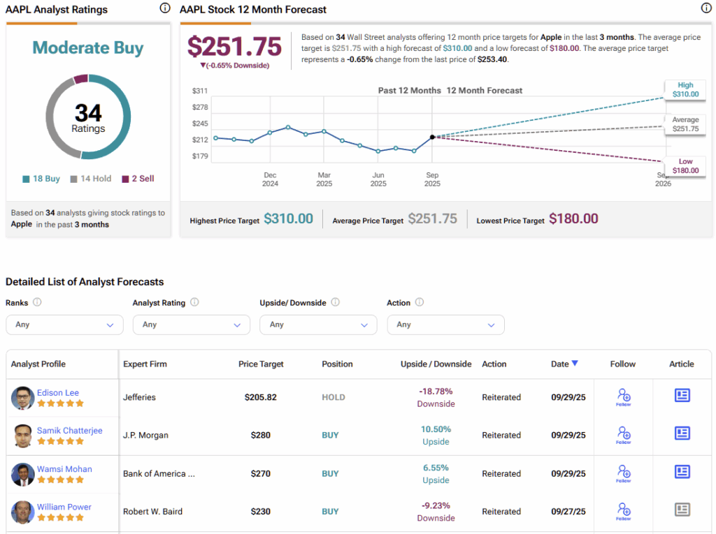 According to TipRanks, Apple carries a Moderate Buy consensus rating based on 34 analyst reviews. Eighteen rate the stock a Buy, 14 a Hold, and two a Sell. Apple’s average stock price target is $251.75, implying a modest downside of less than 1% from current levels, with forecasts ranging from $180 to $310.