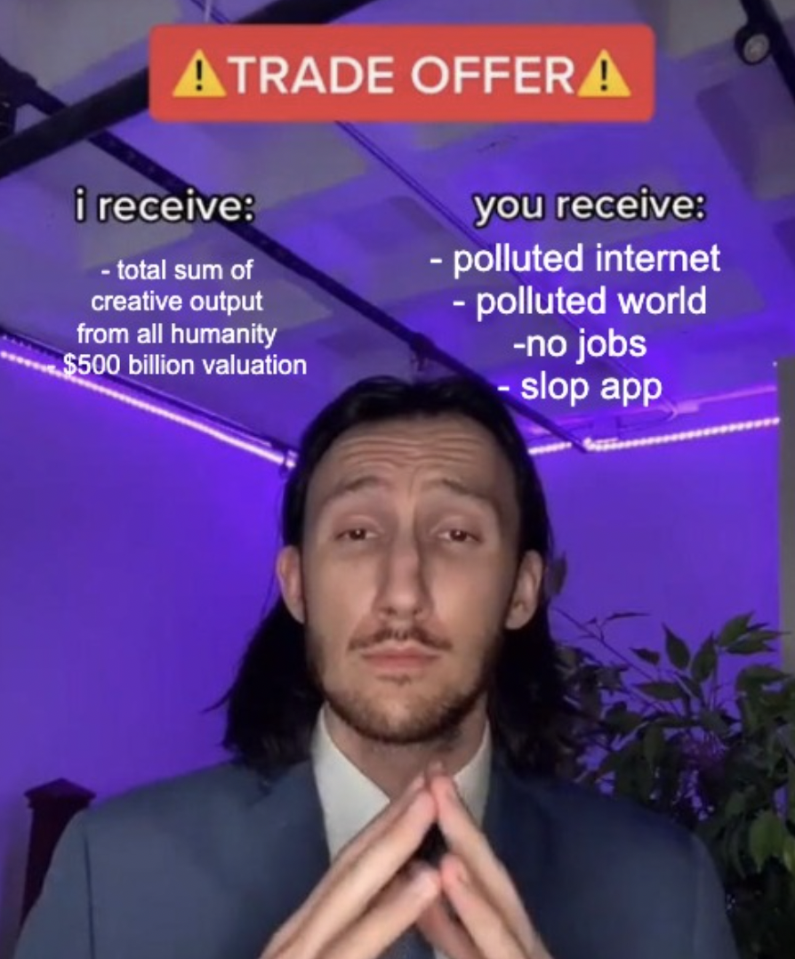 The main immediate use of Sora so far appears to be to allow people to generate brainrot of major beloved copyrighted characters, to say nothing of the millions of articles, blogs, books, images, videos, photos, and pieces of art that OpenAI has scraped from people far less powerful than, say, Nintendo. As a reward for this wide scale theft, OpenAI gets a $500 billion valuation. And we get a tool that makes it even easier to flood the internet with slightly better looking bullshit at the low, low cost of nearly all of the intellectual property ever created by our species, the general concept of the nature of truth, the devaluation of art through an endless flooding of the zone, and the knock-on environmental, energy, and negative labor costs of this entire endeavor.