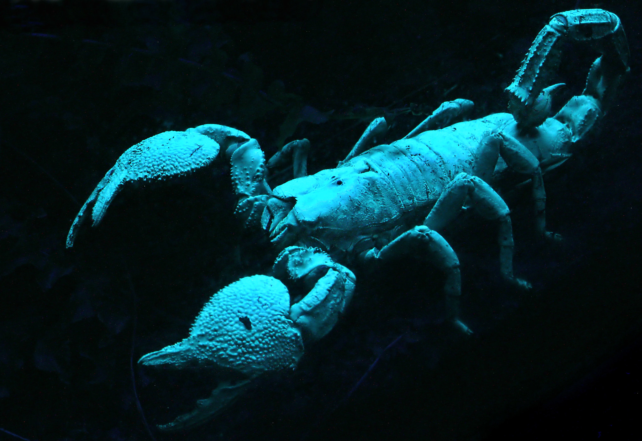 Banner image: An emperor scorpions (Pandinus imperator) fluoresces under UV light. Photo by SonjaV via Flickr.