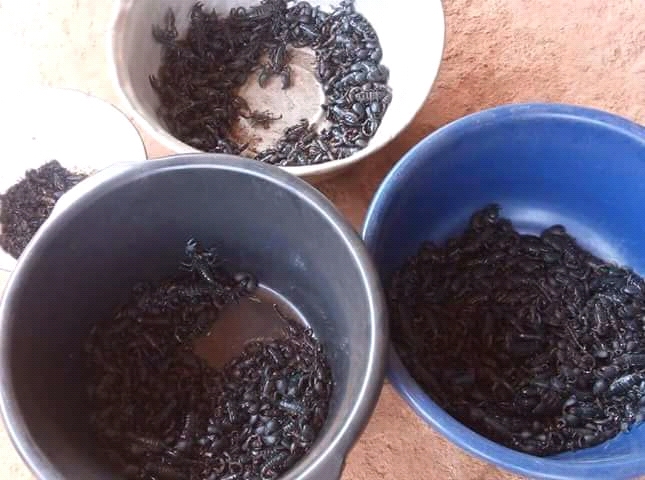 Buckets of emperor scorpions (Pandinus imperator) wild harvested in Cameroon. This species is popular in the pet trade and is one of the few species protected by CITES Appendix II. Photo courtesy of Peter Nsonge.
