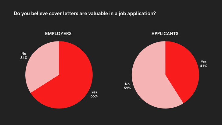 On the question of whether cover letters were valuable, 66% of employers and recruiters said yes, with only 34% saying no. However, only 41% of job seekers said cover letters were valuable, with 59% saying no. Employers and recruiters were therefore 25 percentage points more likely than job seekers to view cover letters as valuable.
