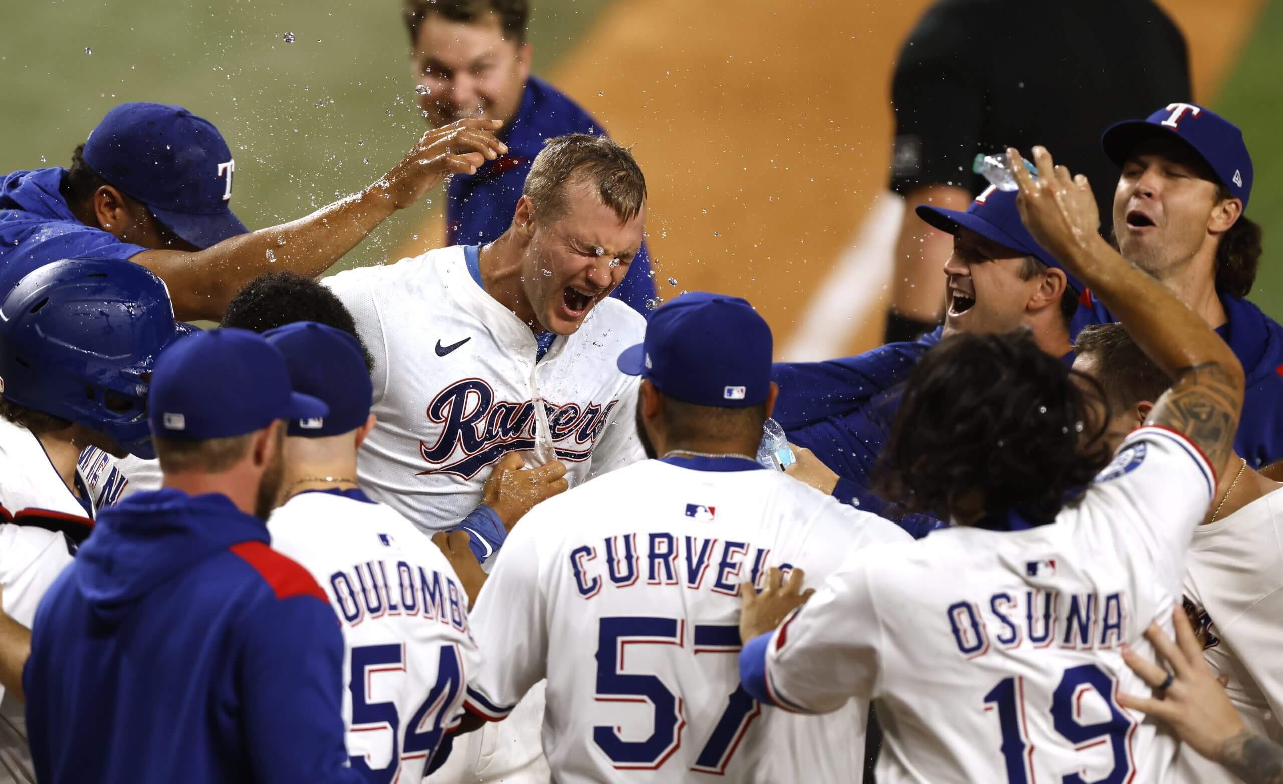 The Rangers celebrate their 10th-inning walk-off win over the Yankees on Aug. 4. After the 8-5 defeat, Giancarlo Stanton addressed the entire team. (Ron Jenkins / Getty Images)