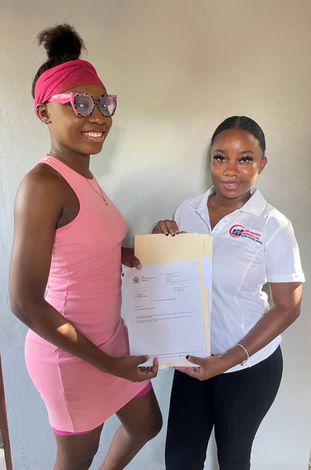 Rasheka Thomas (right), founder of The Equity Experts Limited, presents a tax compliance certificate to a client..