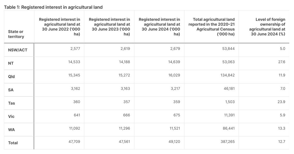 Using the ABS 2020–21 Agricultural Census measure of agricultural land in Australia, the overall proportion of agricultural land with a level of foreign ownership was 12.7pc at the end of June 2024, compared to 12.3pc a year earlier.