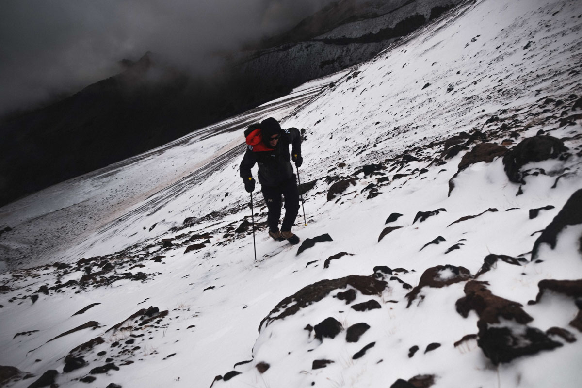 Jornet ascends the snowy slopes of Mount Shasta in California. Afterward, Jornet said this was one of the windiest summits he’s ever had. Photo: Nick Danielson