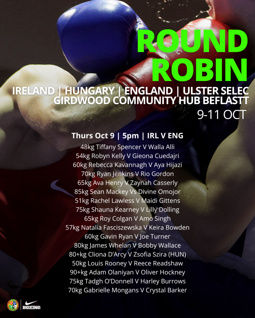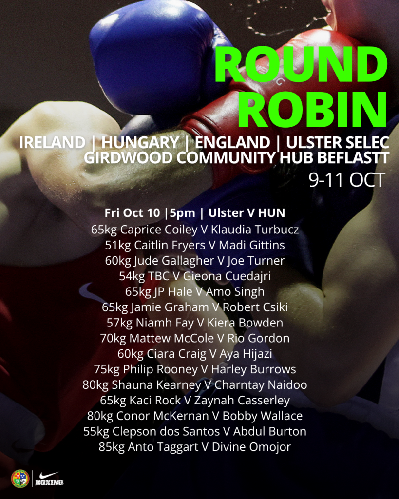 National U23 teams from Hungary and England, and an Ulster Select, will go up against Team Ireland in 6 sessions of boxing across October 9th to 11th, at the Girdwood Community Hub, 10 Girdwood Avenue, Belfast, BT14 6EG