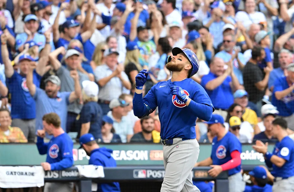 Michael Busch reacts after hitting a home run in the first inning of Game 1.