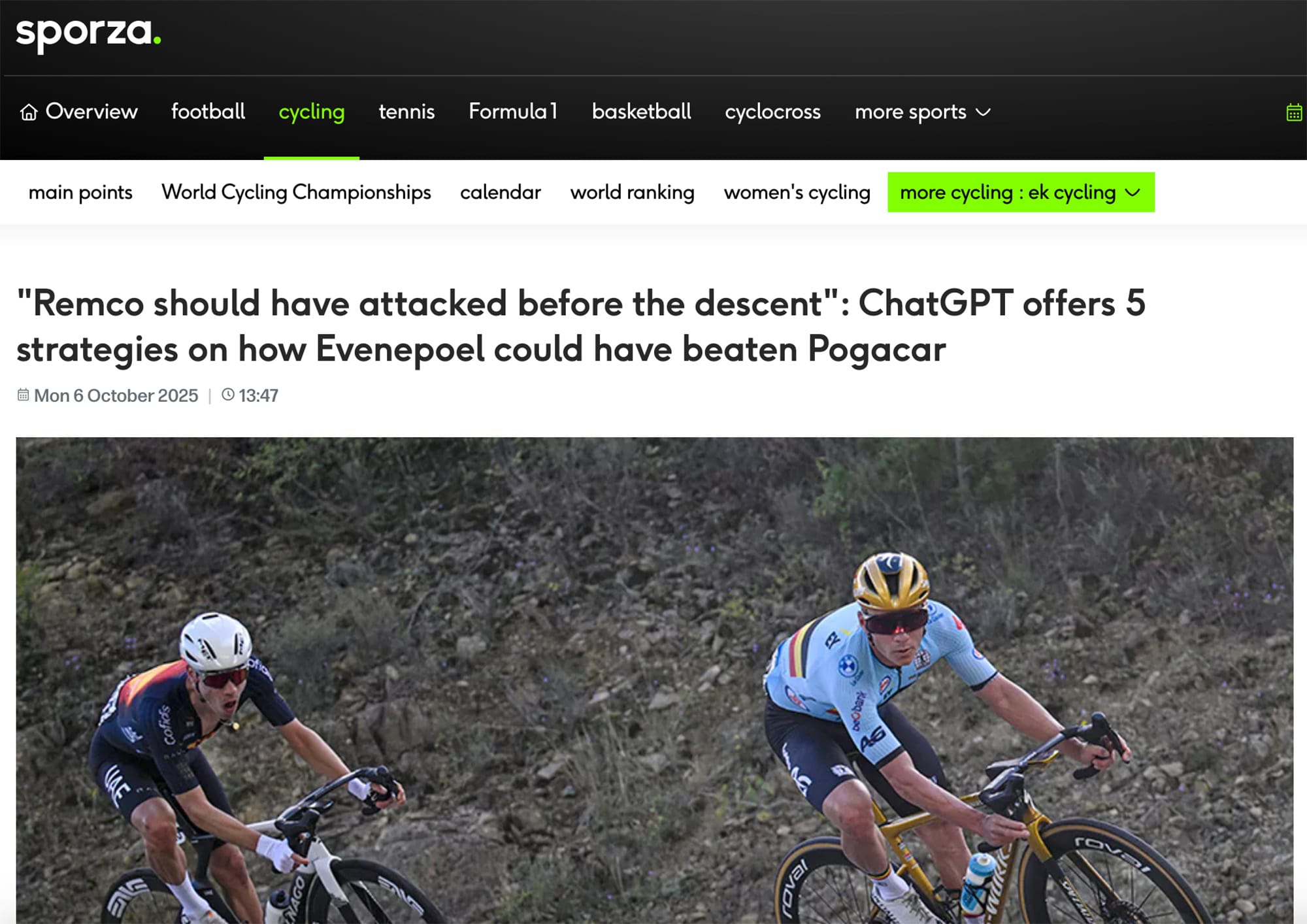 Choose your poison: either AI slop has now conquered even our hospitable little corner of sport/culture, or everyone is so out of ideas as to how to beat Tadej Pogačar, Sporza thought it a legitimately good idea to ask ChatGPT five strategies on how Evenepoel could have beaten Pogačar.