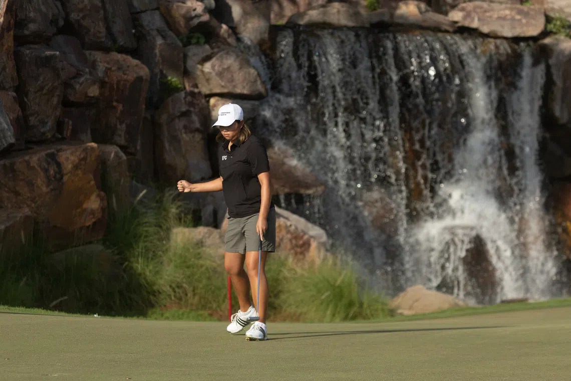 World No. 100 Shannon Tan celebrates after making a putt in the final round of the Hero Women’s Indian Open on Oct 12.