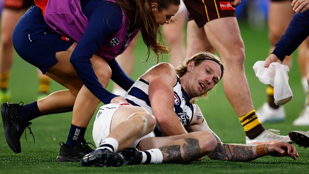 Star Geelong defender Tom Stewart has detailed the emotional toll of missing this year’s AFL grand final after he was sidelined by concussion protocols, while also explaining that he may not have been able to play even the week after due to the severity of the head knock that ended his season.