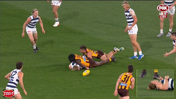 Tom Stewart is attended to by medical staff during the preliminary final against Hawthorn. AFL Photos via Getty Images