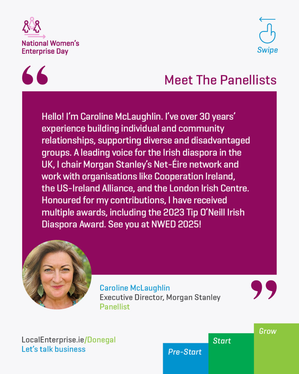 Keynote speaker Tessa Breslin, an internationally recognised leadership advisor to Fortune 500 and FTSE 100 companies, will share perspectives on strategy, resilience, and growth. She will be joined by NWED Donegal Ambassador Olivia Finney, co-founder of New Kid Coffee in Letterkenny, as well as panel speakers Sally Murphy, a TEDx speaker and communications consultant, and Caroline McLaughlin, Executive Director at Morgan Stanley.