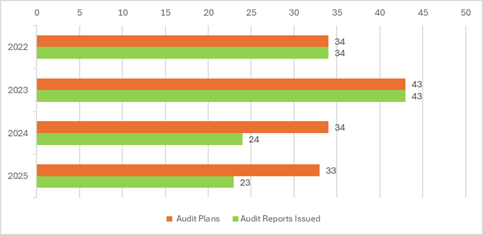 Chart 2: Comparison of Audit Reports Issued vs. Audits Planned for Quadrennial Cycle 2022–2025 (through July 2025)