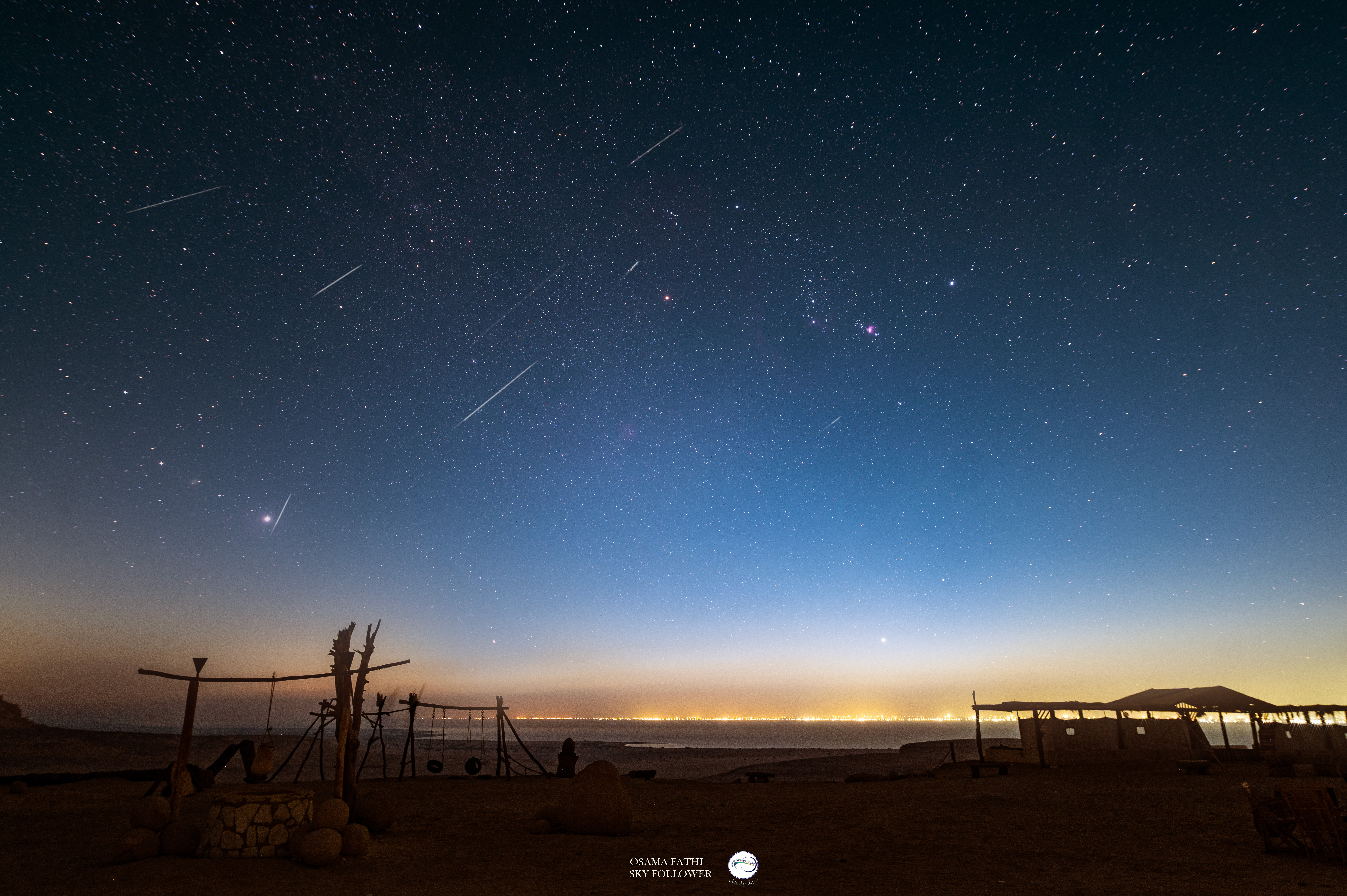 “This composite image combines a few meteor frames captured over three hours from Qatrani, near the northern edge of the lake,” Fathi told Space.com in an email. “Out of more than 200 photos taken during the session, only a handful of bright meteors aligned gracefully near the constellation Orion — visible at the center right of the frame.”