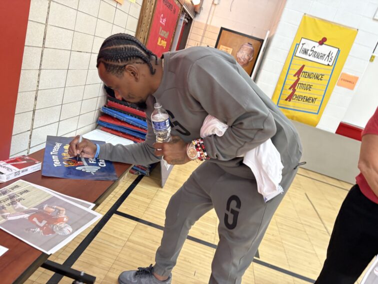 Former Buckeyes and NFL receiver Ted Ginn Jr. was at New Philadelphia’s West Elementary Thursday to speak to the kids, lead them in exercises, and sign autographs.